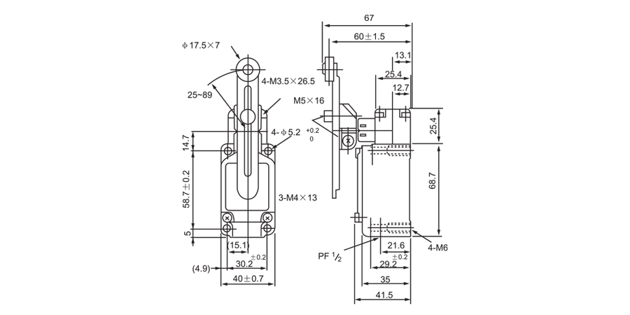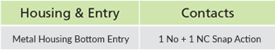 • Contacts: Snap Action 1 NO + 1 NC
